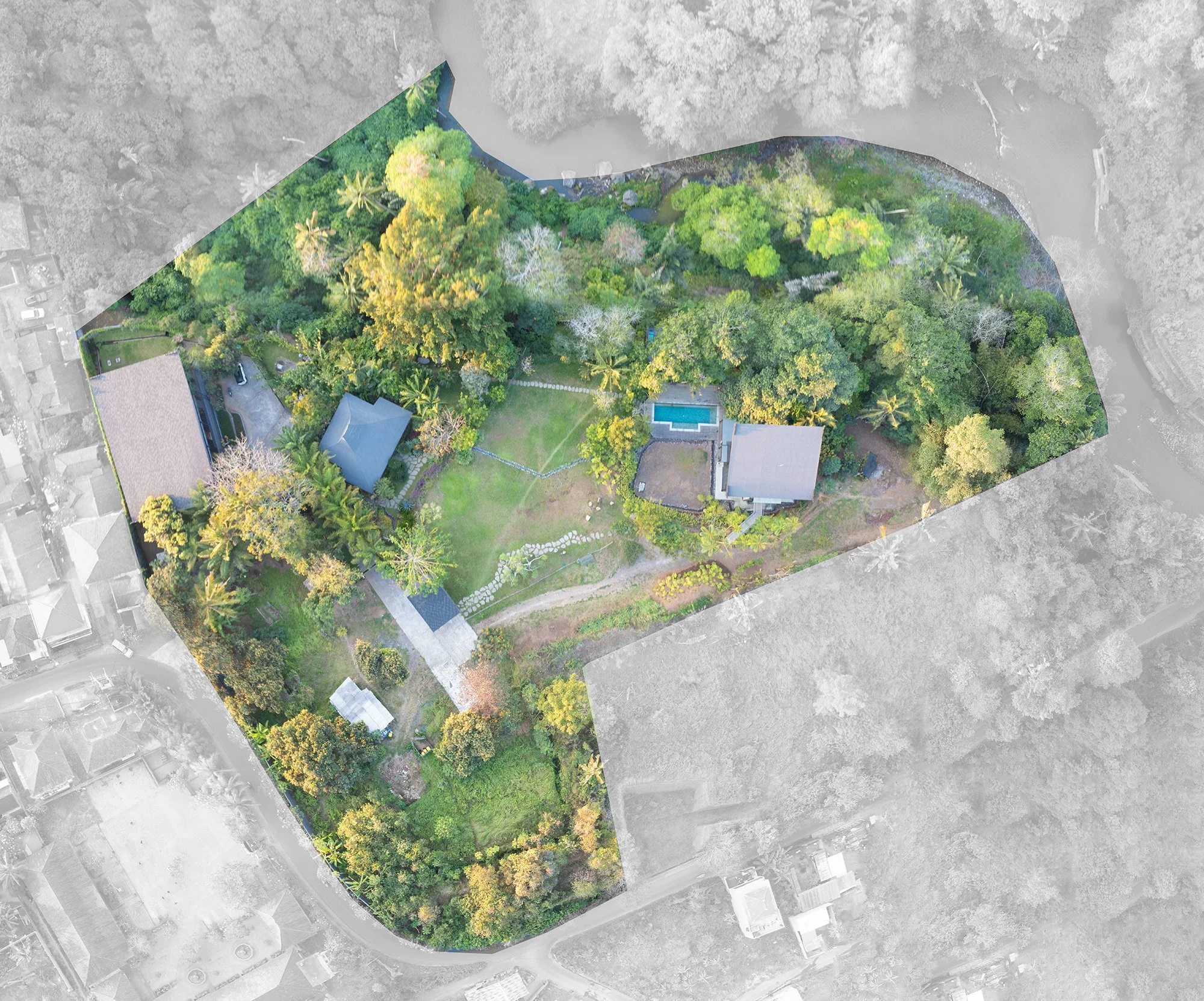 A rare, turnkey riverside estate blending cultural authenticity, privacy, and scalable opportunity. Four acres of lush tropical grounds along the serene Petanu River provide a foundation for a private luxury compound, boutique hotel, wellness retreat, or hybrid lifestyle-and-income vision.