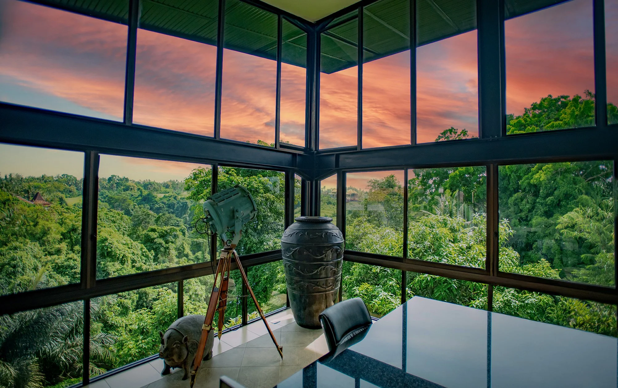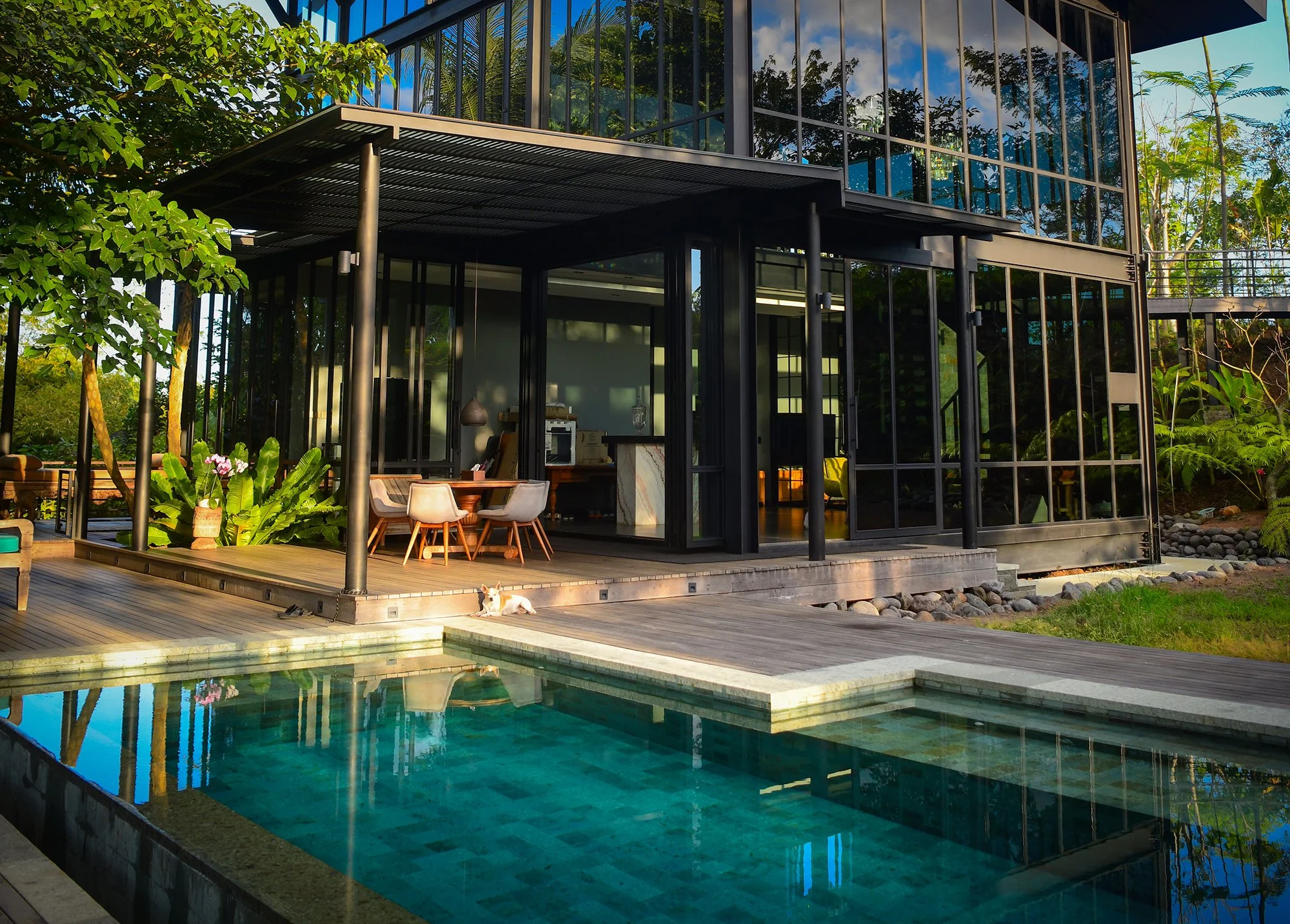Walls of glass frame the river and jungle, while open terraces and decks provide spaces for entertaining, wellness, or quiet contemplation. The pool overlooks the lush canopy, and the outdoor kitchen supports both intimate gatherings and larger retreats.